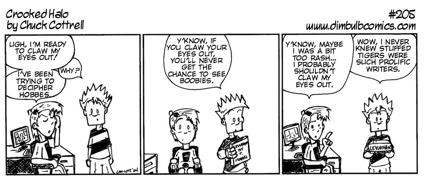 | This one was written while I was working on my Master's Thesis a couple of months back. See, I was having to dig through Thomas Hobbes' Leviathan, which is no task for the faint of heart. I really couldn't resist the urge to make the pun on Hobbes (i.e., the stuffed tiger named for the philospher in the excellent Calvin and Hobbes). Also, my friend Ev said this comic was a little crude, and I figured the comic needed some of that. |
